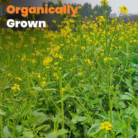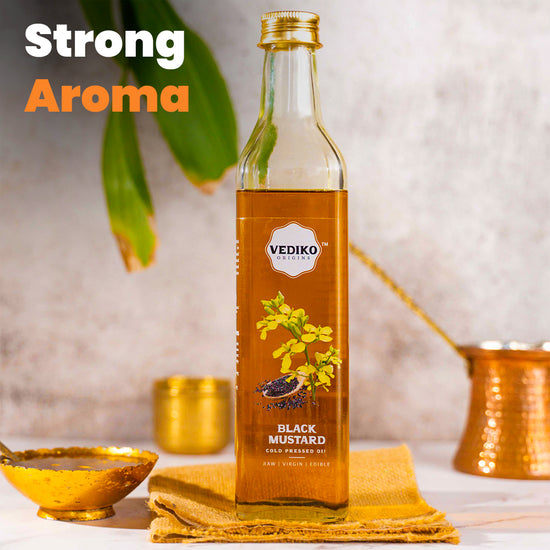 Cold pressed virgin edible oil, made from organically grown black mustard seeds via traditional Kachi Ghani method. No preservatives.
