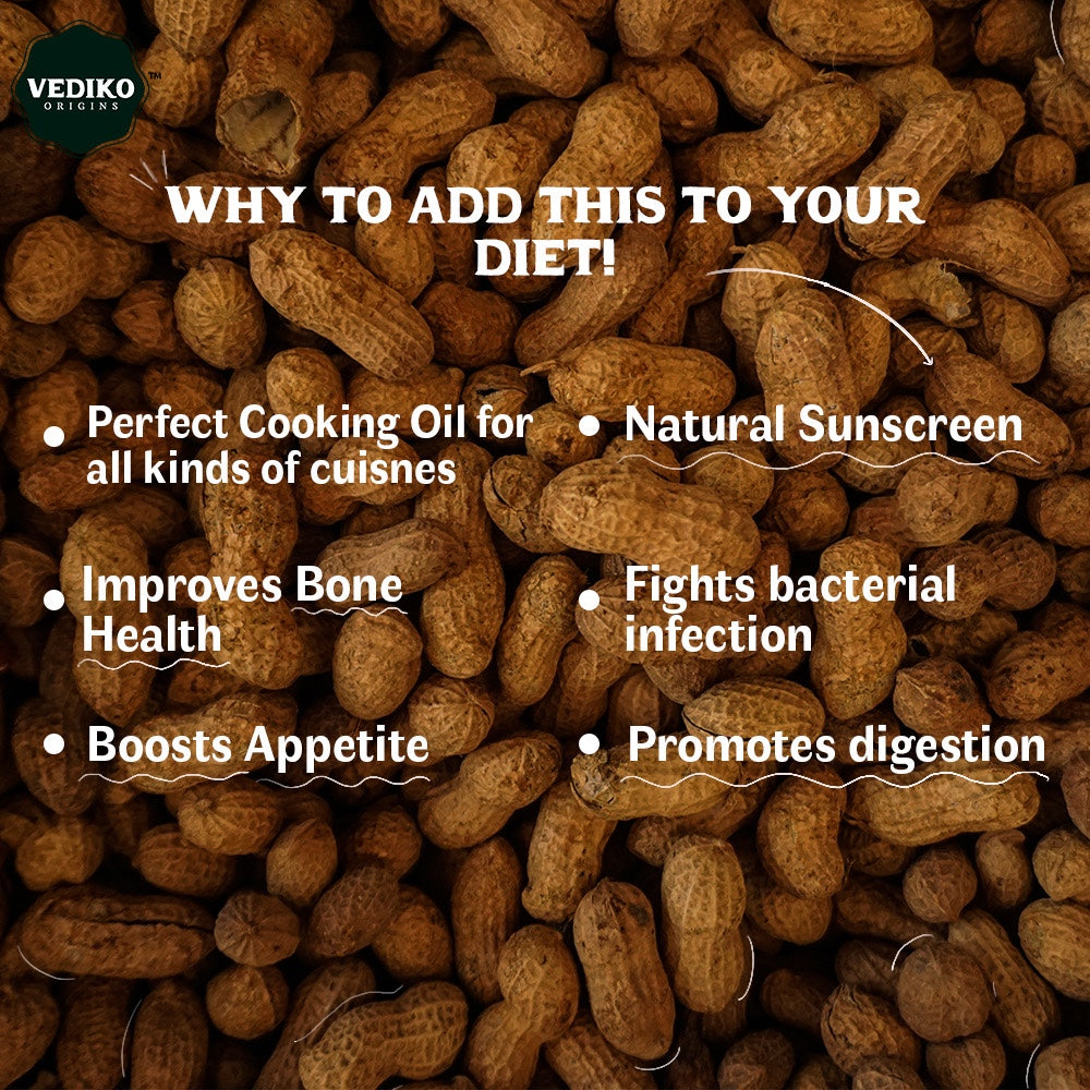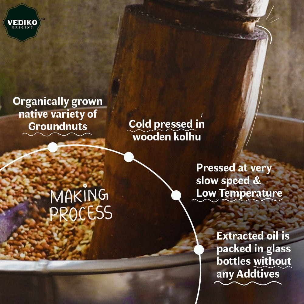 Cold-pressed virgin edible oil, obtained from organically grown native groundnuts via traditional Kachi Ghani method.