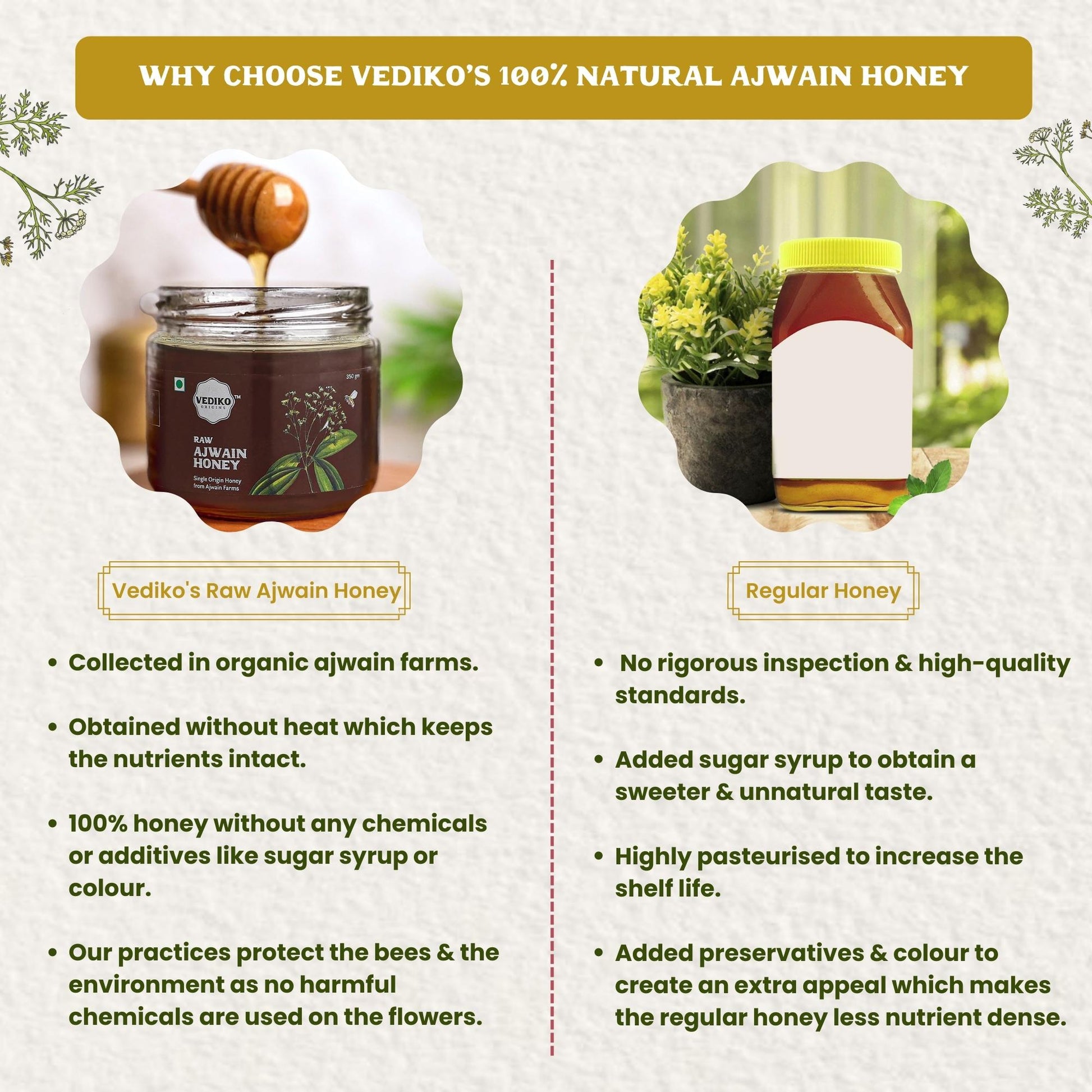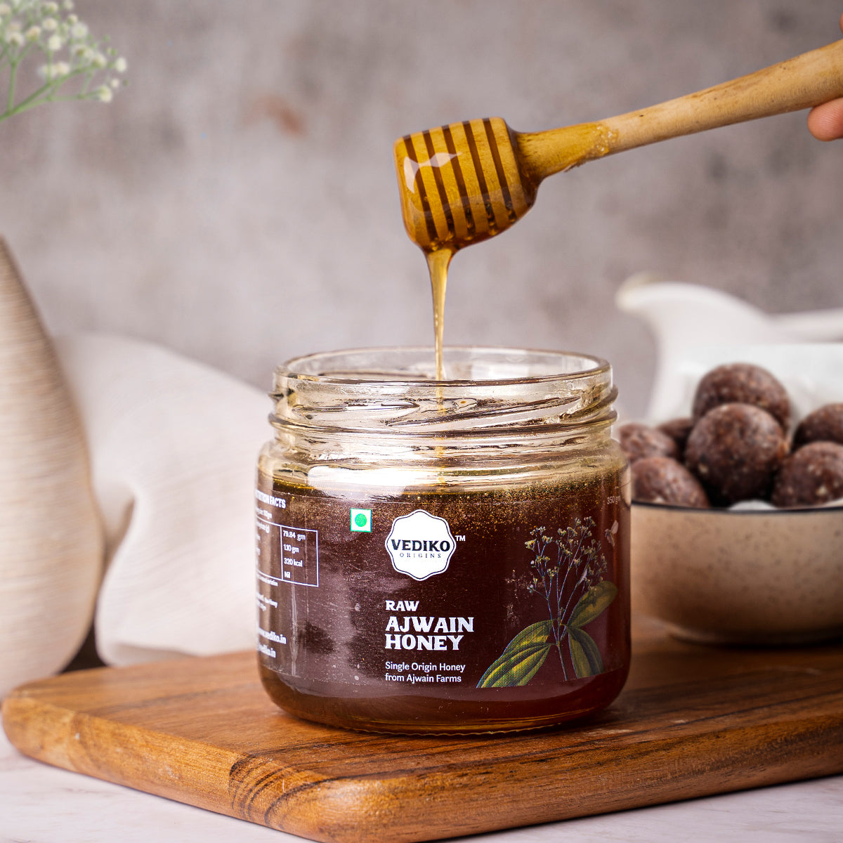 Answer: Vediko’s organic Ajwain Honey combines the benefits of raw Honey with organically grown Ajwain. It helps in preventing acid reflux while fighting harmful infections. It also acts wards off respiratory diseases.