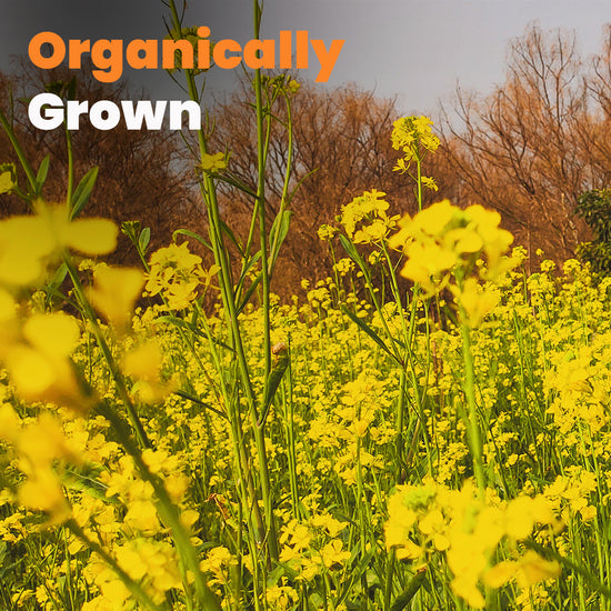 Cold pressed virgin edible oil from organically grown yellow mustard seeds via traditional Kachi Ghani method. No preservatives and No artificial ingredients